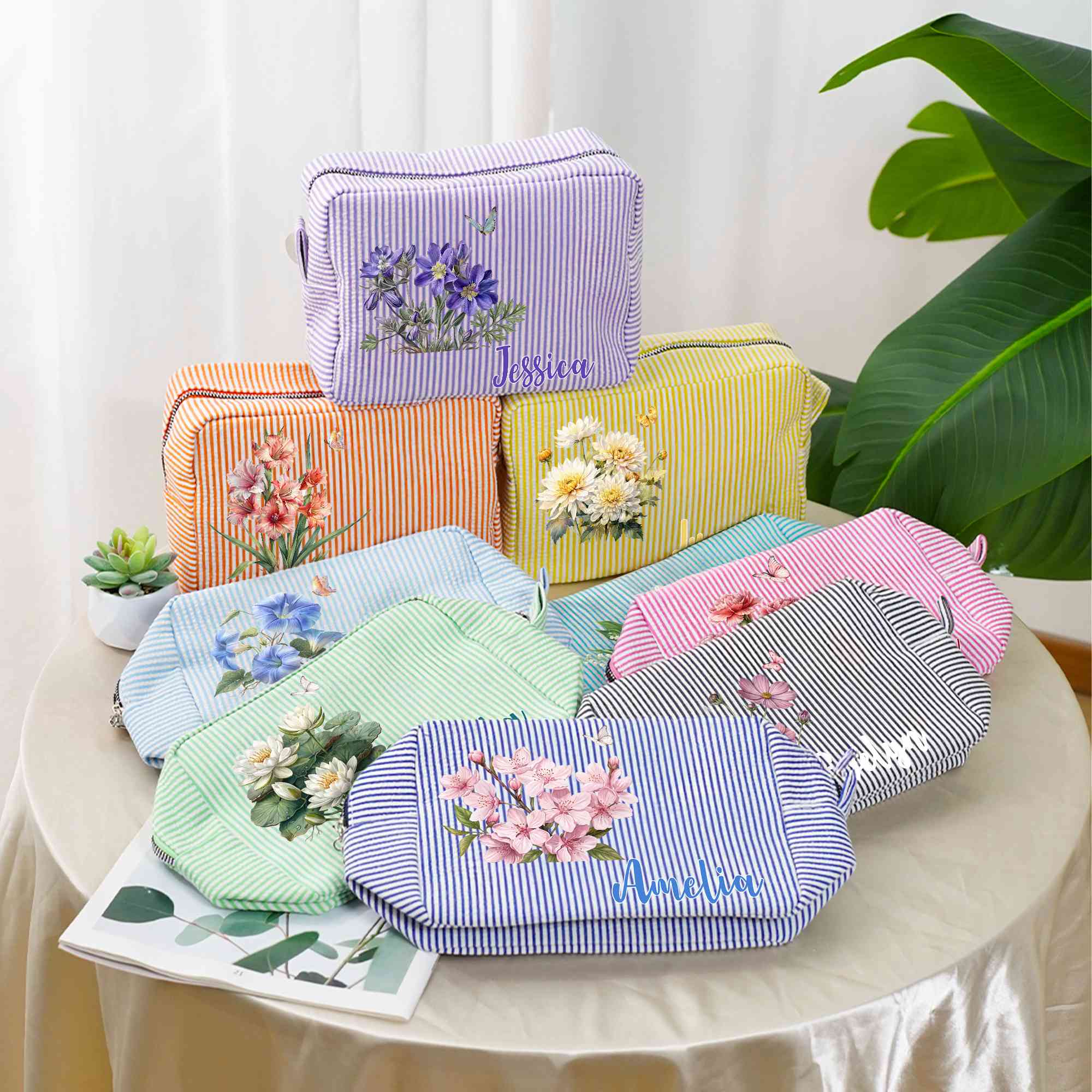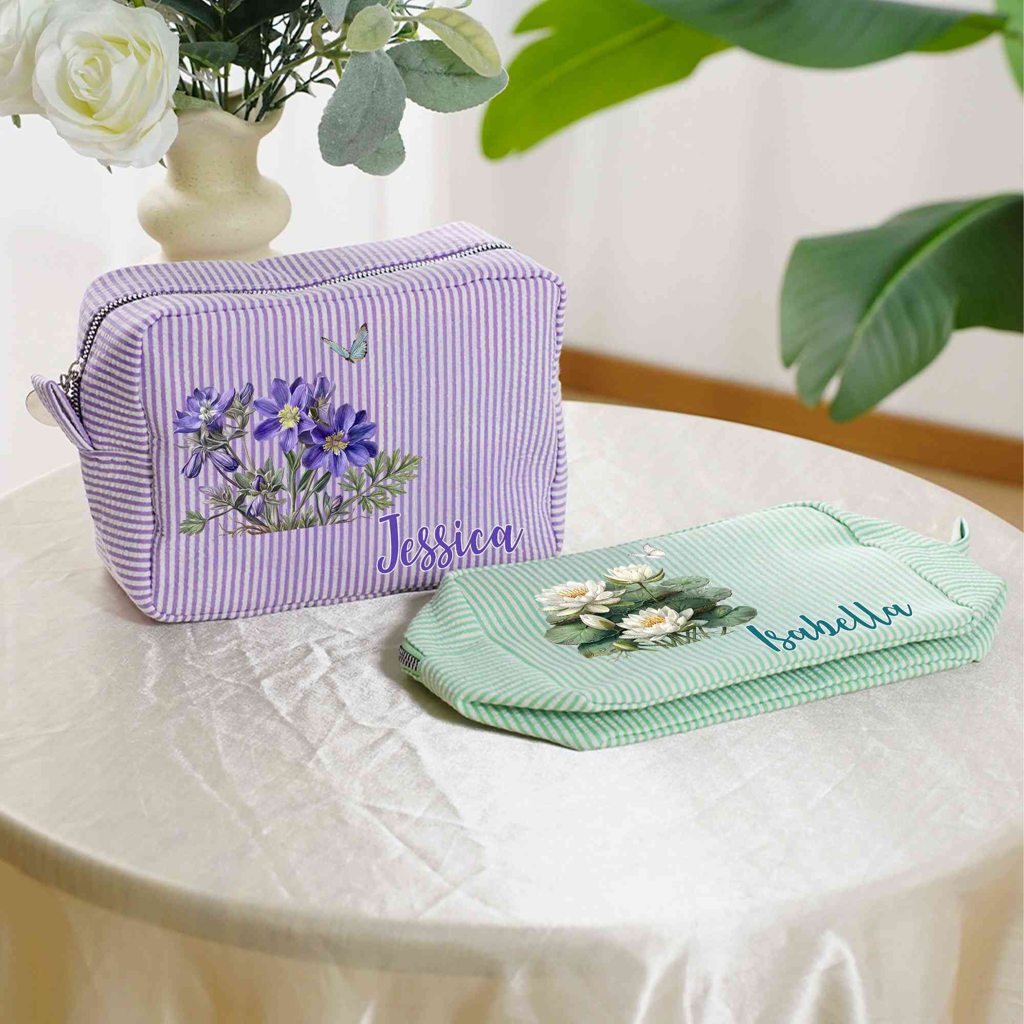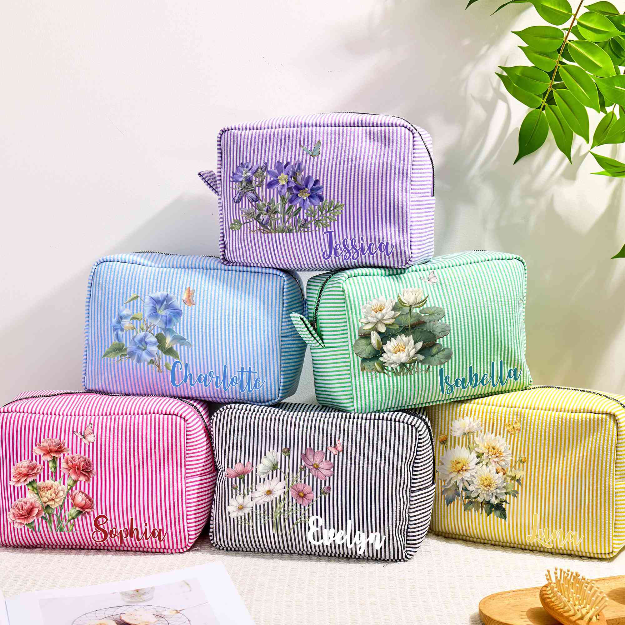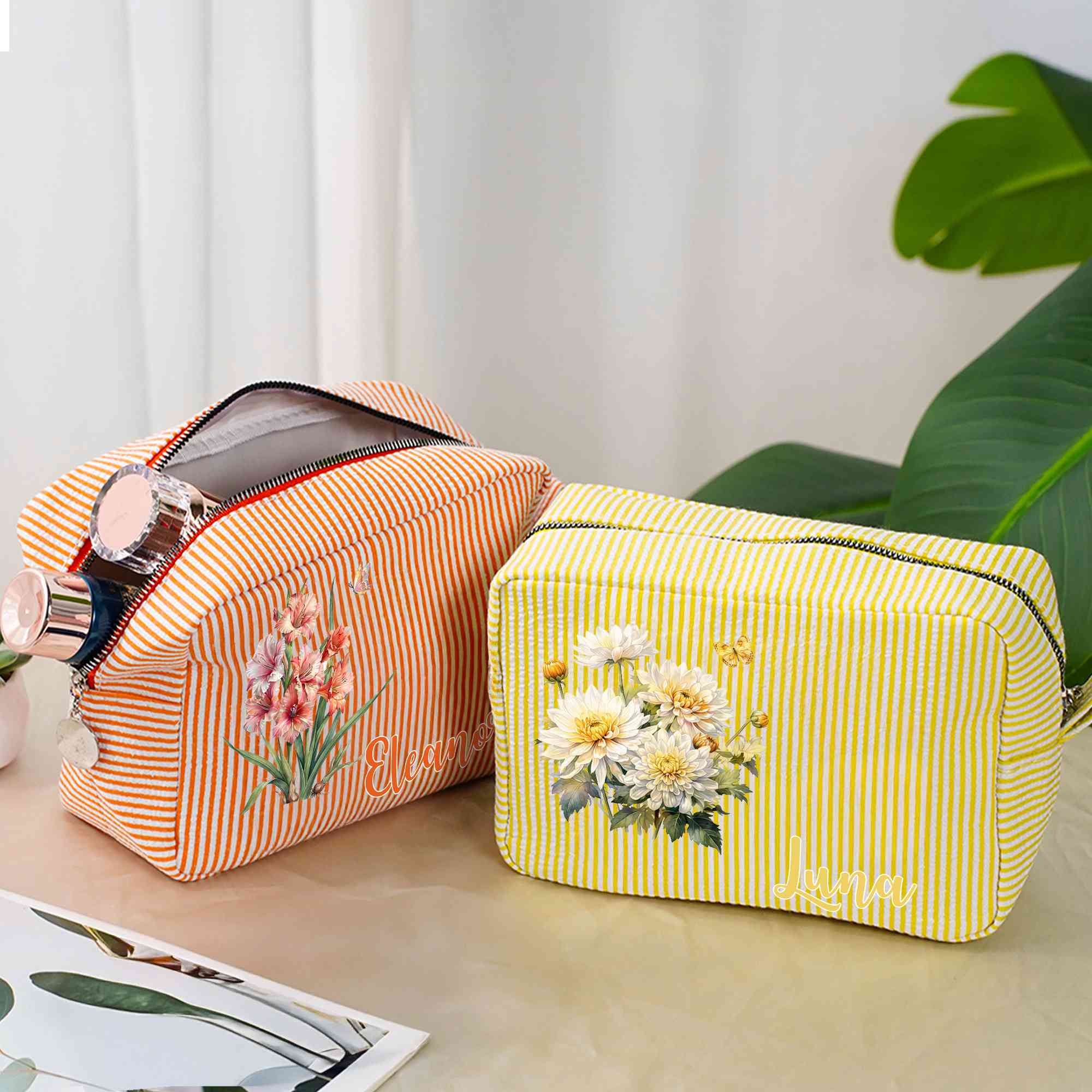 Custom Floral Design - This cosmetic bag features a classic striped backdrop paired with a delicately drawn floral accent for a refined, feminine feel. Personalize it with a chosen name and matching birth flower to create a meaningful accessory that reflects individual style.
