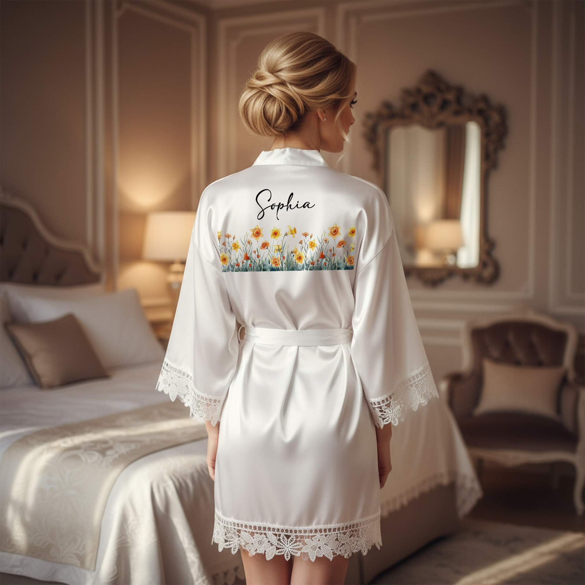 Custom Name Birth Flower Satin Robe with Lace Trim |